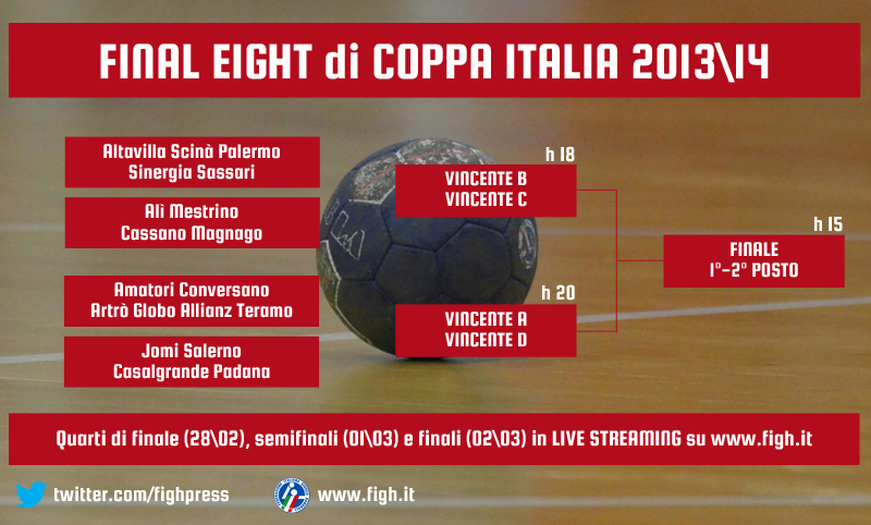 Edizione numero 23. Si comincia. Prende il via domani al Pala Keope di Casalgrande la Final Eight di Coppa Italia femminile 2013/14. S’inizia dai quarti di finale, con tutte le otto formazioni della Serie A1 Femminile protagoniste: alle campionesse in carica della Jomi Salerno si aggiungeranno Amatori Conversano, Alì Mestrino, Altavilla Scinà Palermo, Sinergia Sassari, Cassano Magnago, Artrò Globo Allianz Teramo e Casalgrande Padana.