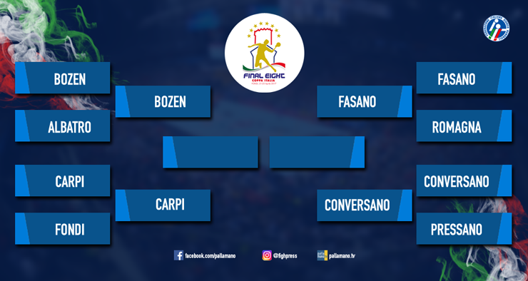 Sono Loacker-Volksbank Bozen – Terraquilia Carpi e Junior Fasano – Conversano sono le semifinali della Final8 che assegnerà, il 23 aprile prossimo, la 32^ edizione della Coppa Italia maschile. Giornata inaugurale di grande interesse a Fondi, con quattro sfide – tutte in diretta su PallamanoTV – che hanno ristretto dunque il campo delle candidate a conquistare il trofeo attualmente nelle mani dei campioni d’Italia del Fasano.