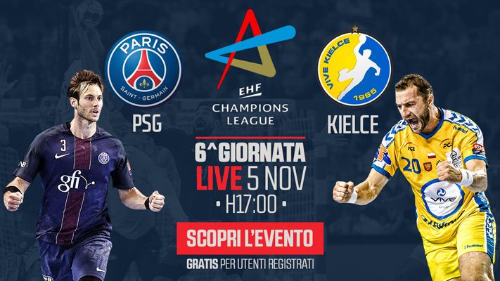 OGGI PSG-KIELCE. La prima sfida nel palinsesto, poi, è quella di oggi, domenica 5 novembre, quando, a partire dalle ore 17:00, saranno in campo i francesi del Paris-Saint-Germain e i polacchi del Kielce. Gara valida per la 6^ giornata del Girone B e in diretta dallo Stade Pierre de Coubertin di Parigi.